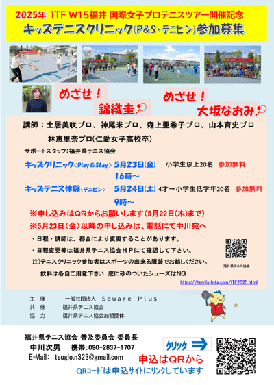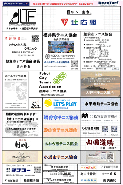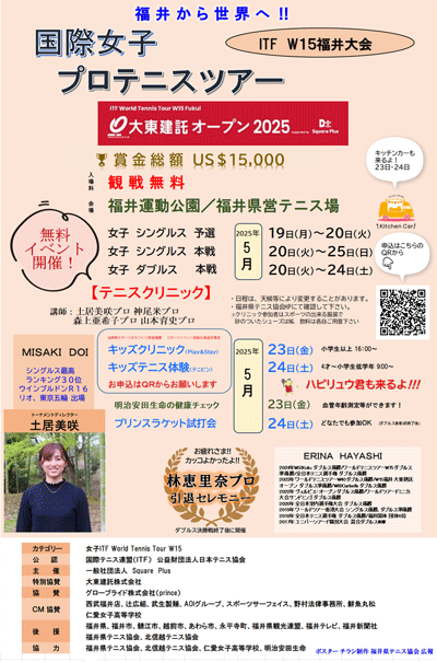 5月19〜25日まで福井県・福井運動公園テニス場にて、国際テニス連盟公認、ワールドテニスツアーW15「大東建託オープン supported by Square Plus」を開催しております。
